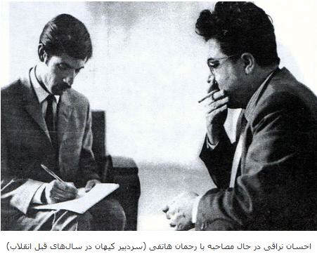 احسان نراقی که در سالهای پیش از انقلاب ریاست "موسسه عالی تحقیقات اجتماعی" را برعهده داشت و سپس به معاونت "یونسکو" رسید و بازنشستگی خود را در ایران می گذراند، در تهران در گذشت. پیرامون او حرف و نظر بسیار است که جای طرح آن در اینجا نیست. مدتی نیز در جمهوری اسلامی زندانی شد. بنی صدر از شاگردان او بود. همچنان که حداد عادل چنین بود. شوروی ستیزی و توده ای ستیزی بنیادی ترین اندیشه نراقی بود. به همان اندازه که شیفته جامعه شناسی به سبک جهان سرمایه داری بود. موسسه ای که او را در زمان شاه در راس آن قرار داده بودند، از جمله نهادهائی بود که رژیم شاه پس از کودتا و پشت سر گذاشتن سالهای تثبیت اختناقی و با حمایت فرح راه اندازی شد. بسیاری از پرورش یافتگان حزب توده ایران که سالهائی را در زندان کودتا گذرانده بودند و در هیچ اداره و نهاد دولتی به آنها کار نمی دانند، در کنار شمار دیگری از پژوهشگران سر از موسسه تحقیقات اجتماعی در آوردند، اما رژیم شاه حتی نتوانست از حاصل اندیشه و مطالعات آنهائی که دراین موسسه جمع شده بودند نیز استفاده کند. اختناق و استبداد به راه خود رفت و مردم به راه خویش. این عکس مربوط به دوران اولیه برپائی موسسه تحقیقات اجتماعی و قرار گرفتن احساس نراقی در راس آنست. آن که از جانب روزنامه کیهان به ماموریت مصاحبه با نرقی رفته "رحمان هاتفی" است که بعدها معاون سردبیر و در سال انقلاب 57 سردبیر کیهان شد. این عکس را در کنار چند عکس دیگر و گزارشی که از فعالیت های نراقی و شجره روحانی وی در سایت "تورجان" منتشر شده بود برگرفته ایم.