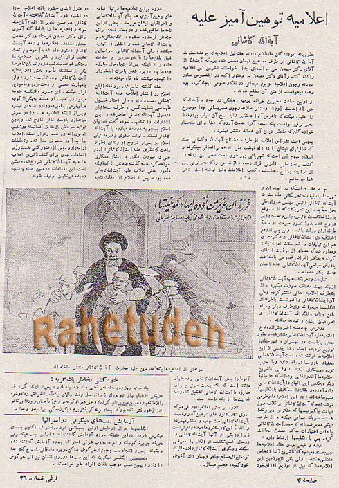 حالا خواندن مصاحبه سپهبد زاهدی عامل کودتای 28 مرداد که شاه فراری را به کشور باز گرداند و خود برای مدتی نخست وزیر شد، شاید به کمک مقدمه بالا قابل درک تر باشد. این سند را در ادامه "حزب توده ایران به روایت اسناد مطبوعاتی" منتشر می کنیم. این سند مربوط به تعلل دکتر مصدق در مقابله پیگیر با خیزهای کودتائی است که سرانجام به کودتای 28 مرداد ختم شد و مصدق تعلل کرد در بستن چشمه با یک بیل خاک و زمانی که سیل کودتا راه افتاد دیگر امکان جلوگیری از آن بسیار محدود شده بود. از مهرماه 1331 تا مرداد 1332 که کودتای 28 مرداد موفق شد دولت مصدق را سرنگون کند، بیشترین فشار تبلیغاتی و یورش اوباش سازمان یافته در حزب زحمتکشان بقائی متوجه حزب توده ایران شد و دربار شاهنشاهی از این یورش ها حمایت کامل کرد. دست های پنهان انگلستان و کارگزاران آن در داخل کشور و حاکمیت، شبکه مطبوعاتی- تبلیغاتی معروف به "بدامن" را با کمک تعدادی از روزنامه نگاران وقت شکل دادند. یکی از این کارزارهای تبلیغاتی را در پوستر تبلیغاتی علیه آیت الله کاشانی می بینید. پوستری که کاشانی توده ای ها را بغل کرده است. این تبلیغات از آنجا تشدید شد که آیت الله کاشانی با میتینگ مشترک توده ای ها و ملیون در ابن بابویه تهران در سالروز قیام 30 تیر موافقت کرده بود. از ماجرای حمایت حزب توده ایران از آیت الله برقعی برای شرکت در کنگره صلح جهانی نیز ارتجاع و دربار شاهنشاهی کمال سوء استفاده را کردند. این کوشش را هم در تحریک آیت الله بروجردی مرجع اعلم تقلید شیعیان می خوانید. آیت الله برقعی، روحانی نواندیشی بود که برای خاتمه بخشیدن به جنجال هائی که روحانیون مرتجع و عوامل دربار شاهنشاهی در قم براه انداخته بودند، قم را ترک کرد. آگاهی از این رویدادها و توطئه ها، برای درک شرایط کنونی کشور، آنقدر اهمیت دارد که بتوان گفت: از غفلت های رهبری وقت حزب توده ایران در سال های پس از انقلاب57 تشویق نکردن نسل جوان توده ای برای یافتن و خواندن این بخش از تاریخ سال های منجر به کودتای 28 مرداد، نقش ارتجاع مذهبی در آن ها و بویژه جمع آوری اسناد و مدارک مطبوعاتی منتشر شده در این سالهاست. شاید کوشش امروز ما، بار اندکی را در این زمینه برداشته و نسل جوان ایران را بتواند بیش از نسل جوان انقلاب 57 با واقعیات و تاریخ به روایت مطبوعات آشنا کند. ـــــــــــــــــــــــــ تلگرام راه توده: https://telegram.me/rahetudeh
