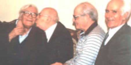 از راست به چپ محمود ژندی مدیری روزنامه "بسوی آینده"، مهندس عباس گِرمان و کاوه دهگان که بر گونه محمد قاضی بوسه می زند. این عکس نیز مانند عکس تک نفره کاوه دهگان را از گنجینه خاطرات نصرت الله نوح مرد حافظه ایران، در سایت اینترنتی وی با نام "سفینه نوح" و "پژواک" گرفته ایم. |