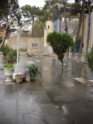 سنگ فرش مانده با گلدان هائی که در عکس دیده می شود سنگ قبر پشت و رو شده ارانی است که زیر این سنگ فرش ها پنهانش کرده اند |