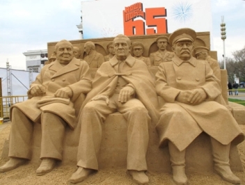 کنفرانس تهران- گزارش مترجم استالین- 12 رهبران سه کشور از تهران رفتند که دوست یکدیگر باقی بمانند! در میان دیگر مسایل کنفرانس، مسئله ایران نیز مورد مذاکره قرار گرفت. سه رهبر ائتلاف ضد هیتلری اعلامیه ویژه ای را تصویب کردند که طی آن ضمن تائید کمک های ایران به ائتلاف، بویژه در زمینه حمل بار به اتحاد شوروی، موافقت کردند به ایران هم در زمان جنگ و هم در دوران پس ازجنگ کمک اقتصادی شود و از استقلال کامل، حاکمیت و تمامیت ارضی آن حمایت شود. درپایان کنفرانس سندی به نام «اعلامیه تهران» تصویب شد. عکس: مجسمه شنی سه رهبر متفقین ( از راست به چپ) استالین رهبر وقت شوروی ، روزولت رییس جمهور وقت آمریکا و چرچیل نخست وزیر وقت انگلیس در زمان جنگ دوم جهانی . این مجسمه در مسکو به نمایش گذاشته شد. |