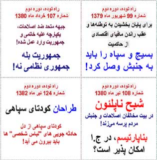 -------------------- خواب های خونین فرمانده کل قوا در جمهوری اسلامی اکبر گنجی، روزنامه نگار افشاگر دوران اولیه جنبش اصلاحات، که در زندان بسر می برد، دفتر دوم مانیفست جمهوریخواهی خود را در آستانه انتخابات ریاست جمهوری ایران به خارج از زندان فرستاد. او مقدمه ای بر این دفتر نوشته که بنظر ما از متن دفتر پر اهمیت تر است. اینکه او، بعنوان یک زندانی ارتجاع و مافیای قدرت چگونه می اندیشد بجای خود محترم است، اما اینکه او در زندان اوین شاهد چه تدارکاتی برای پس از انتخابات ریاست جمهوری است، اهمیت عام و عمومی دارد. به همین دلیل بخش های مستند و خبری مقدمه دفتر دوم مانیفست او را، برگرفته از اصل متن سند و در تکمیل سرمقاله ای که در این شماره راه توده می خوانید منتشر می کنیم. -------------------- آغاز مرحله "پس از ثبت نام کاندیداها" درمقابل تمرکز قدرت به هر قیمت باید ایستاد شرایط، توازن نیرو، امکانات و خطرات پیش رو، تفاهم بر سر حداقل ها را به یک ضرورت تاریخی تبدیل کرده است. این که در خرداد 1376 این توازن چگونه بود؟ دراین 8 سال از همه ظرفیت ها استفاده شد یا نشد؟ اشتباهات کجا بود و یا نبود؟ اختلاف نظرهای داخلی چقدر عمل کرد؟ همه و همه مربوط به دیروز است. امروز باید "سخن از امروز" گفت و از تمرکز قدرتی که زیر شعار فاشیستی "مرگ بر ضد ولایت فقیه" لباس نظامی نیز برتن کرده جلوگیری کرد. |